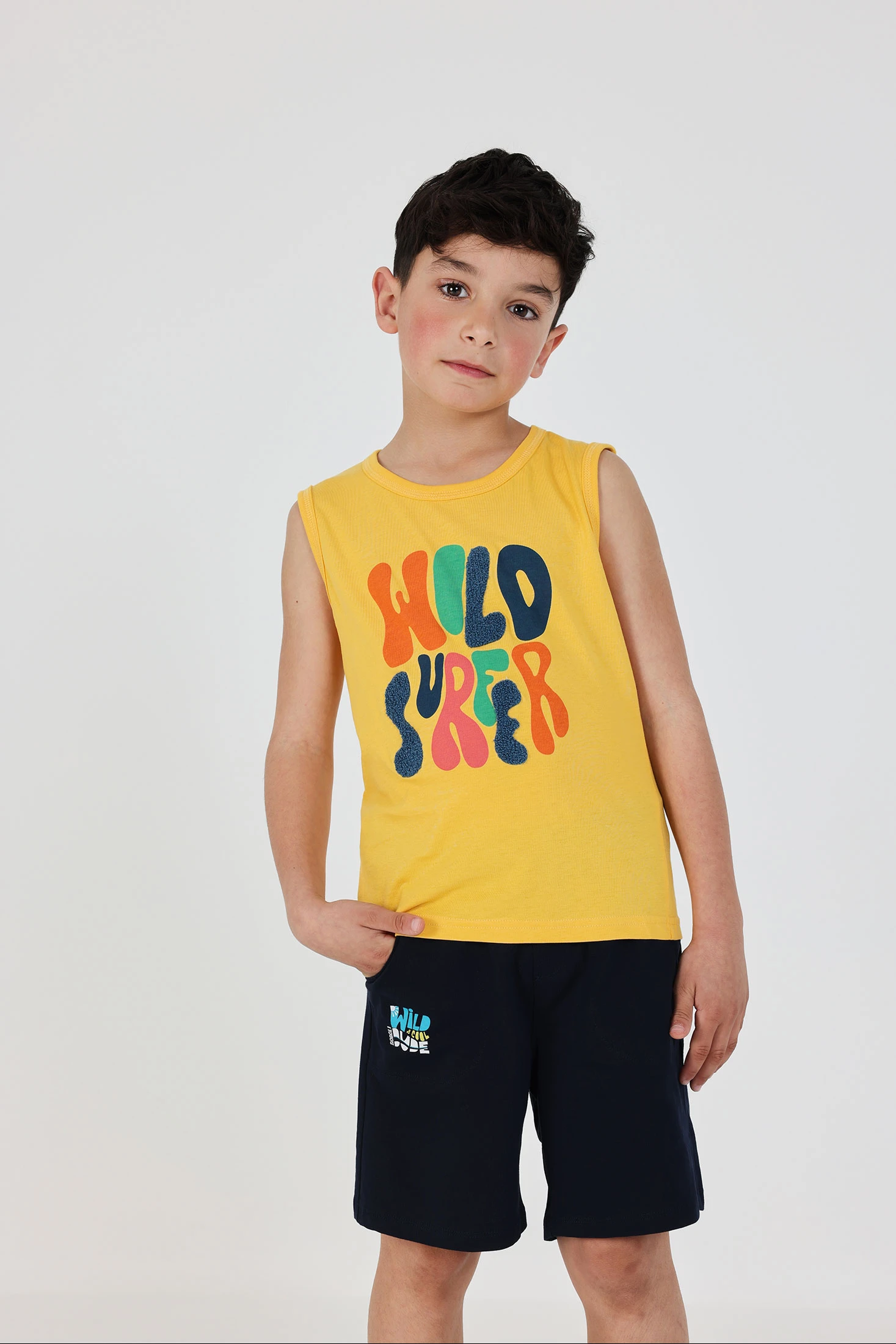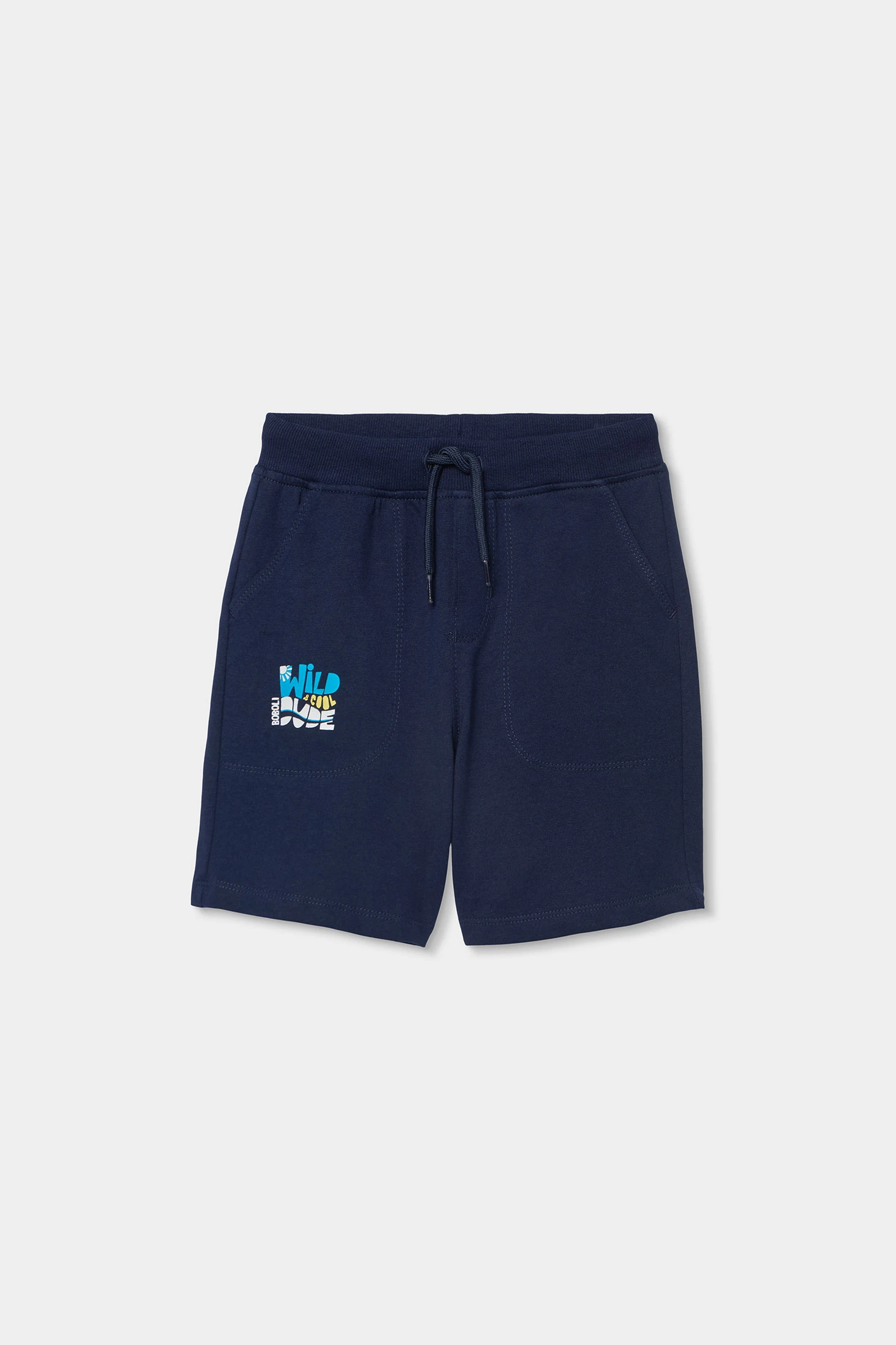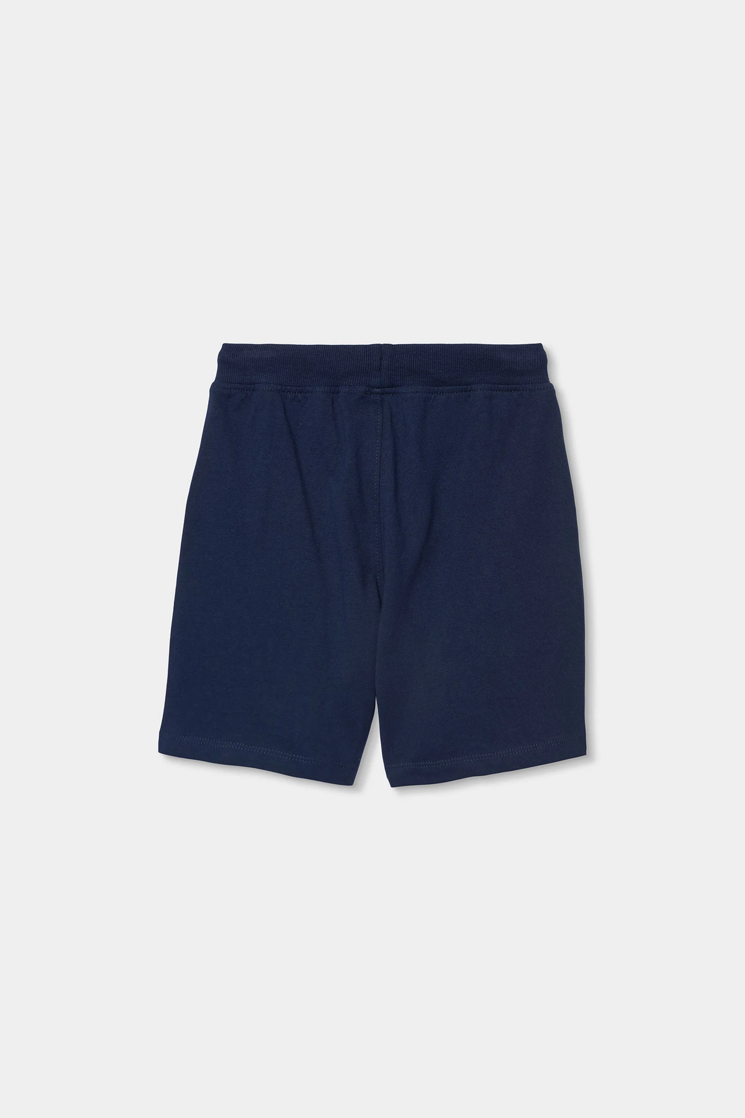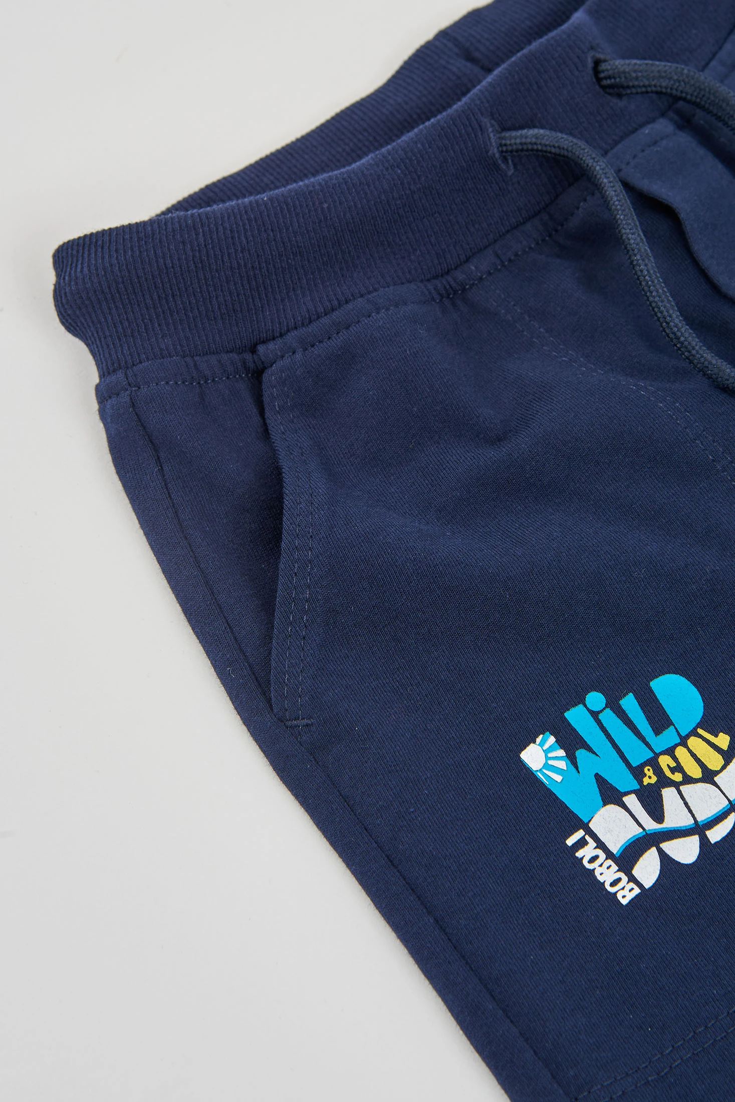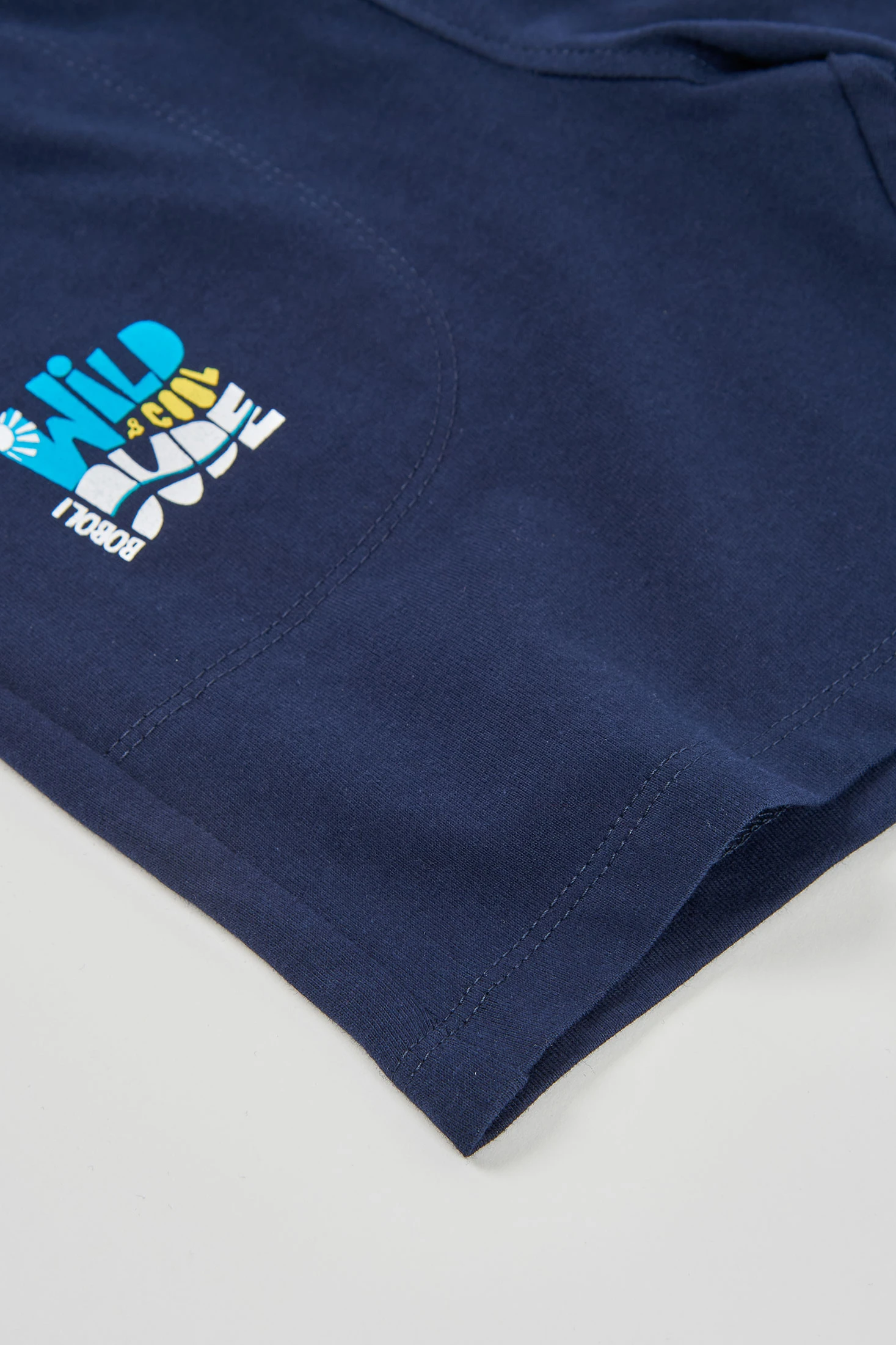 Bermudas en maille de couleur bleu marine, idéales pour les enfants de 12 mois à 14 ans. Confectionnées dans un tissu doux et confortable, parfait pour un usage quotidien. Le design inclut un petit imprimé latéral avec le mot "WILD" et un cordon ajustable à la taille, offrant un ajustement sécurisé. Parfaites pour assortir avec des t-shirts ou des sweat-shirts, créant un look décontracté et confortable, idéal pour toute activité en plein air.