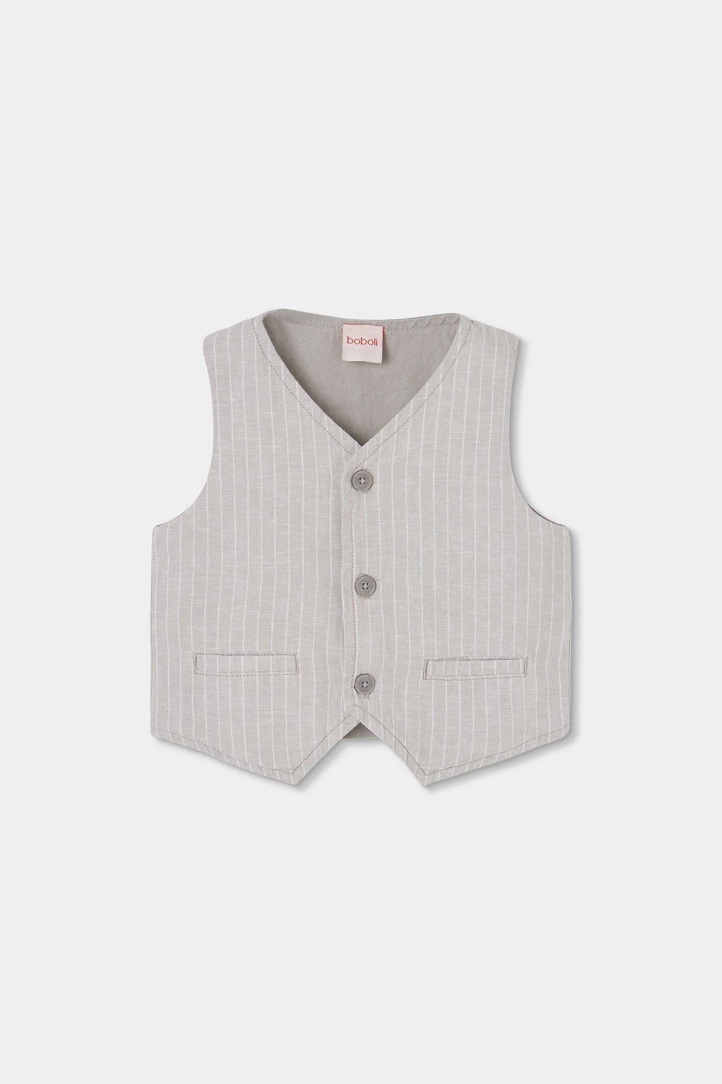 Gilet en lin pour enfant parfait pour un look élégant et frais. Il présente un design rayé dans une douce couleur beige, idéal pour se marier avec différents styles. Il est confectionné dans un matériau léger et respirant, offrant un confort en toute occasion. Disponible en tailles de 12 mois à 12 ans, il s'adapte à la croissance des plus petits. Gilet avec fermeture à boutons et deux poches décoratives à l'avant, ajoutant une touche chic. Parfait pour les événements formels ou pour ajouter une touche sophistiquée au quotidien.