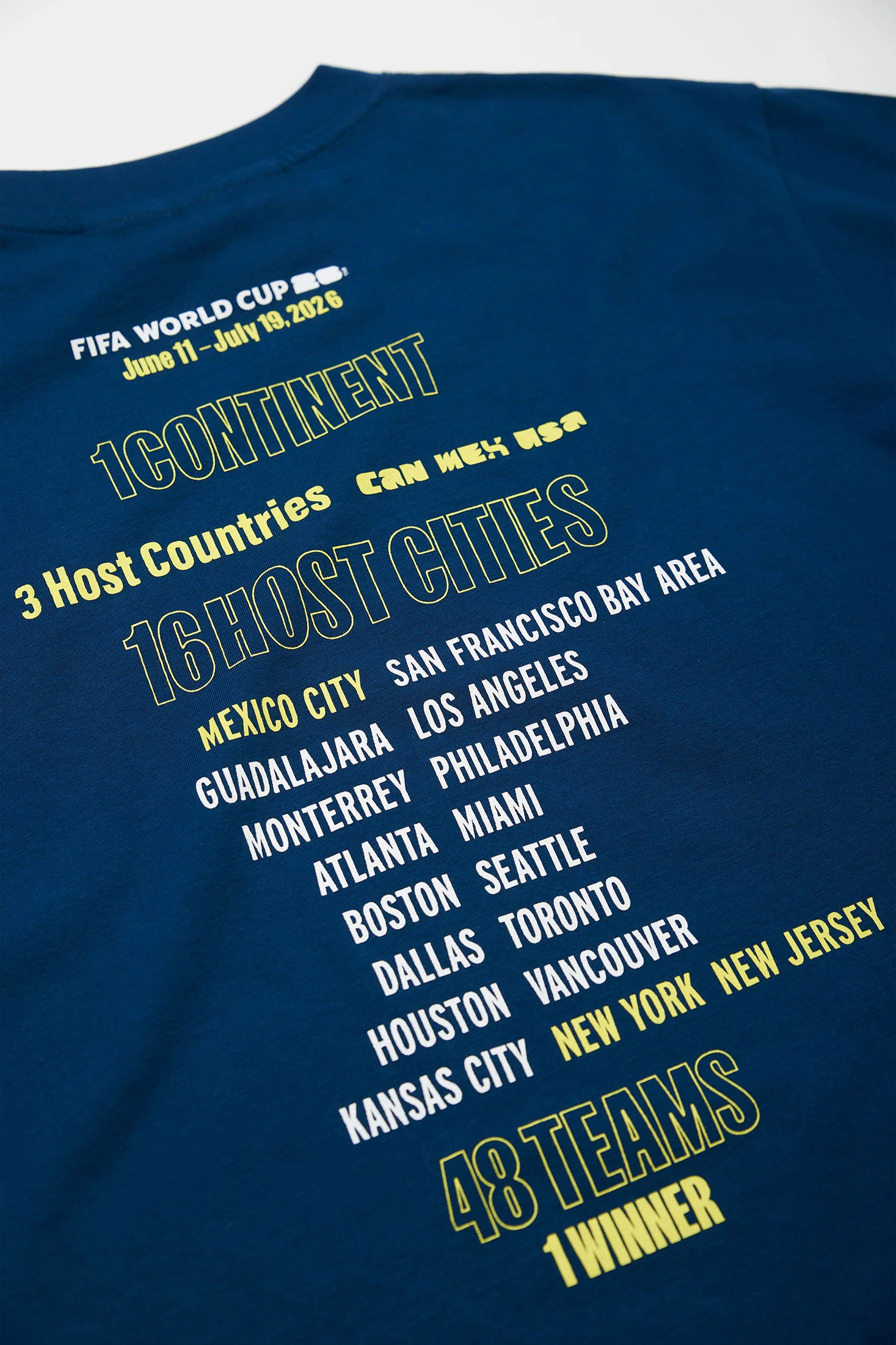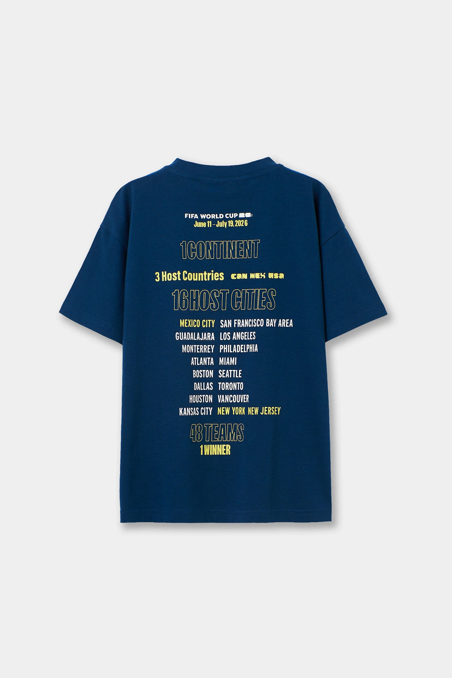 Ce t-shirt pour garçon en couleur bleu marine associe un imprimé frontal centré avec le logo FIFA WORLD CUP 2026©, et un dos accrocheur qui rassemble toutes les données du tournoi : 1 continent, 3 pays hôtes, 16 villes hôtes, 48 équipes et 1 vainqueur. Un design très détaillé pour les plus passionnés de football. Manches courtes et col rond. Disponible en tailles de 4 à 14 ans.