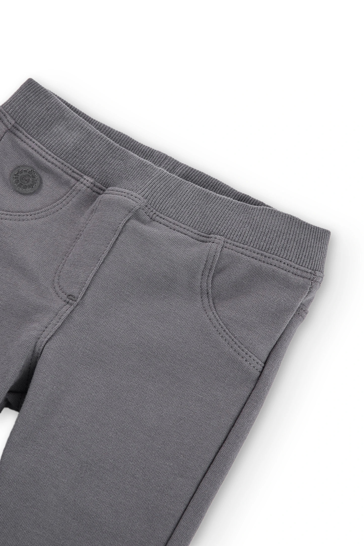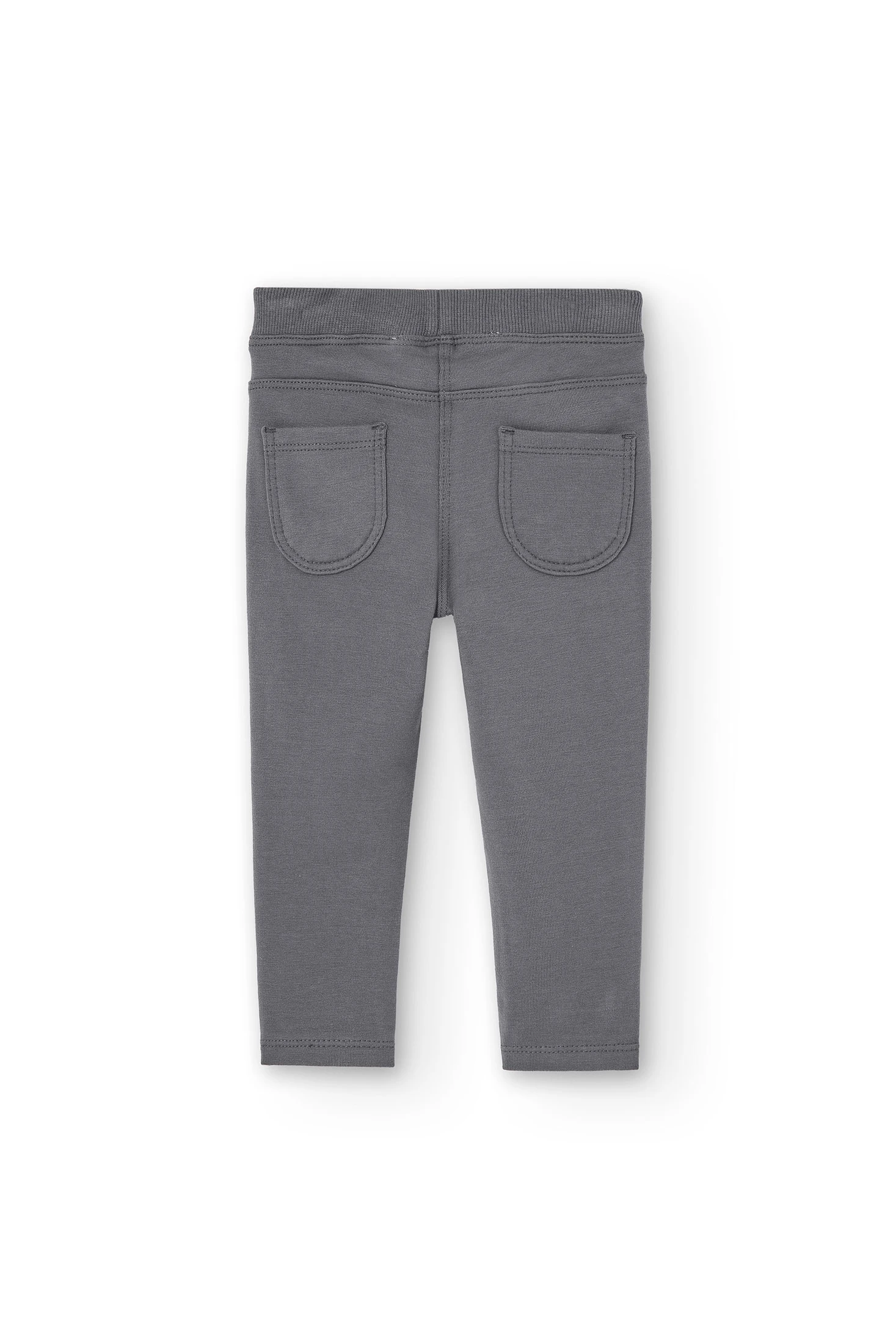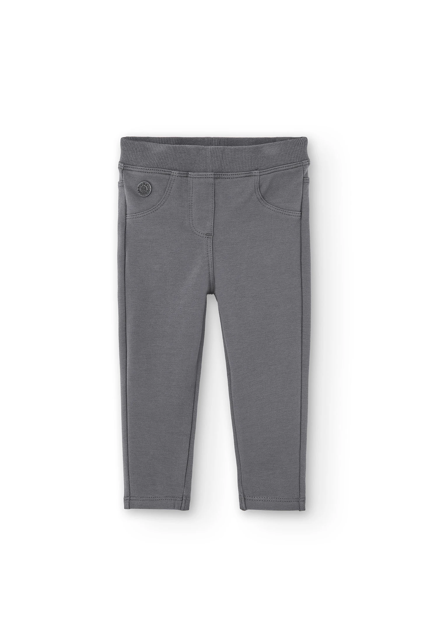 Pantalon fille en polaire élastiquée gris foncé, les poches avant et la braguette sont juste pour la décoration, taille élastique. La décoration est une étiquette avec le détail de la marque. Disponible de la taille 6 mois à 6 ans.