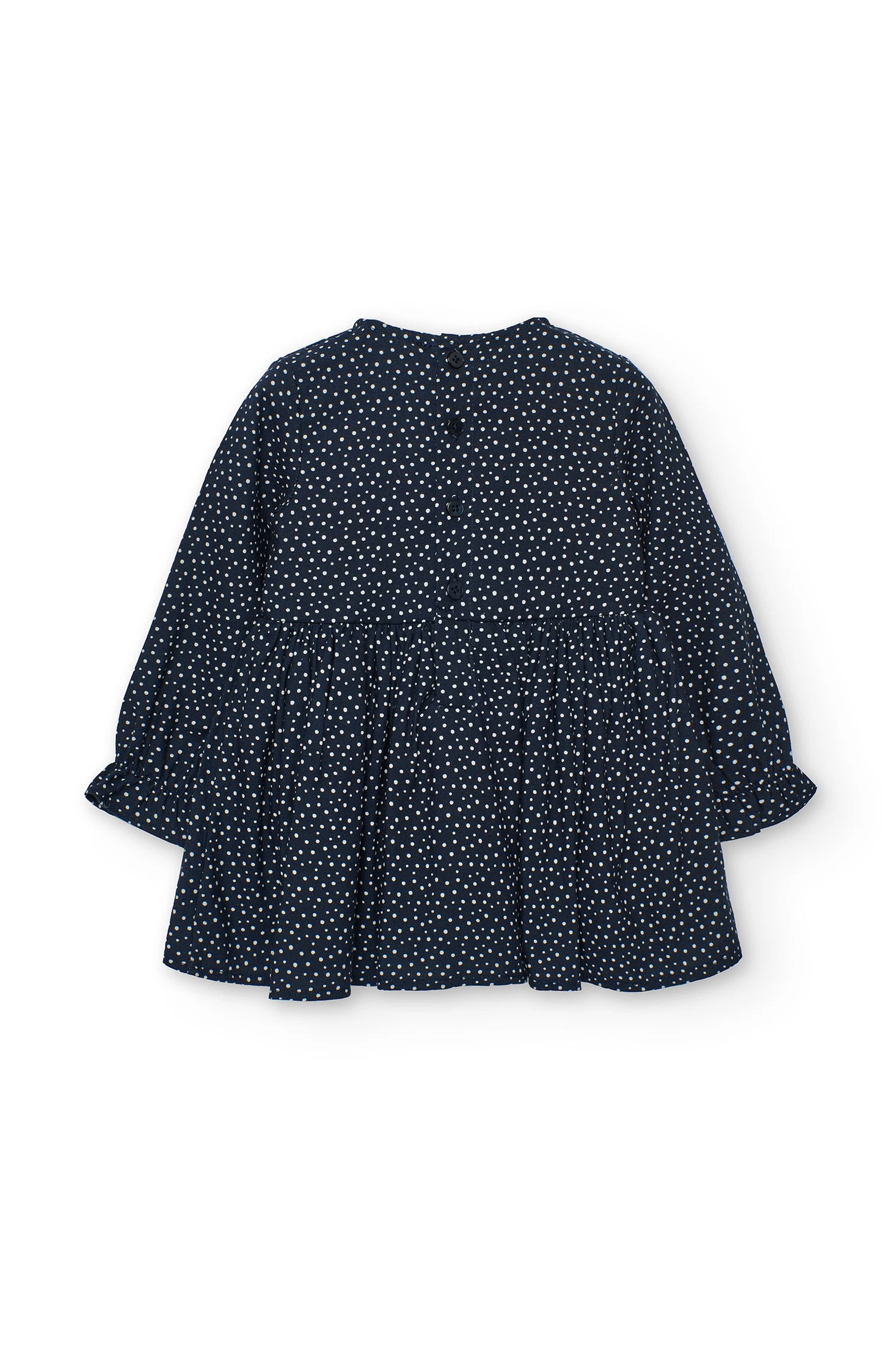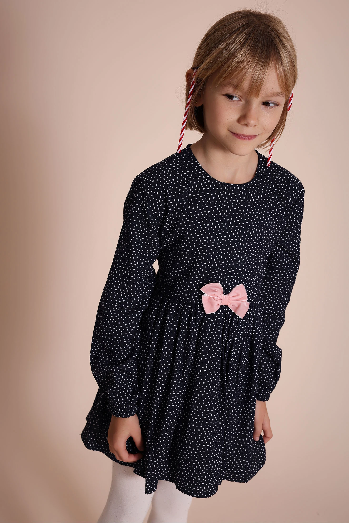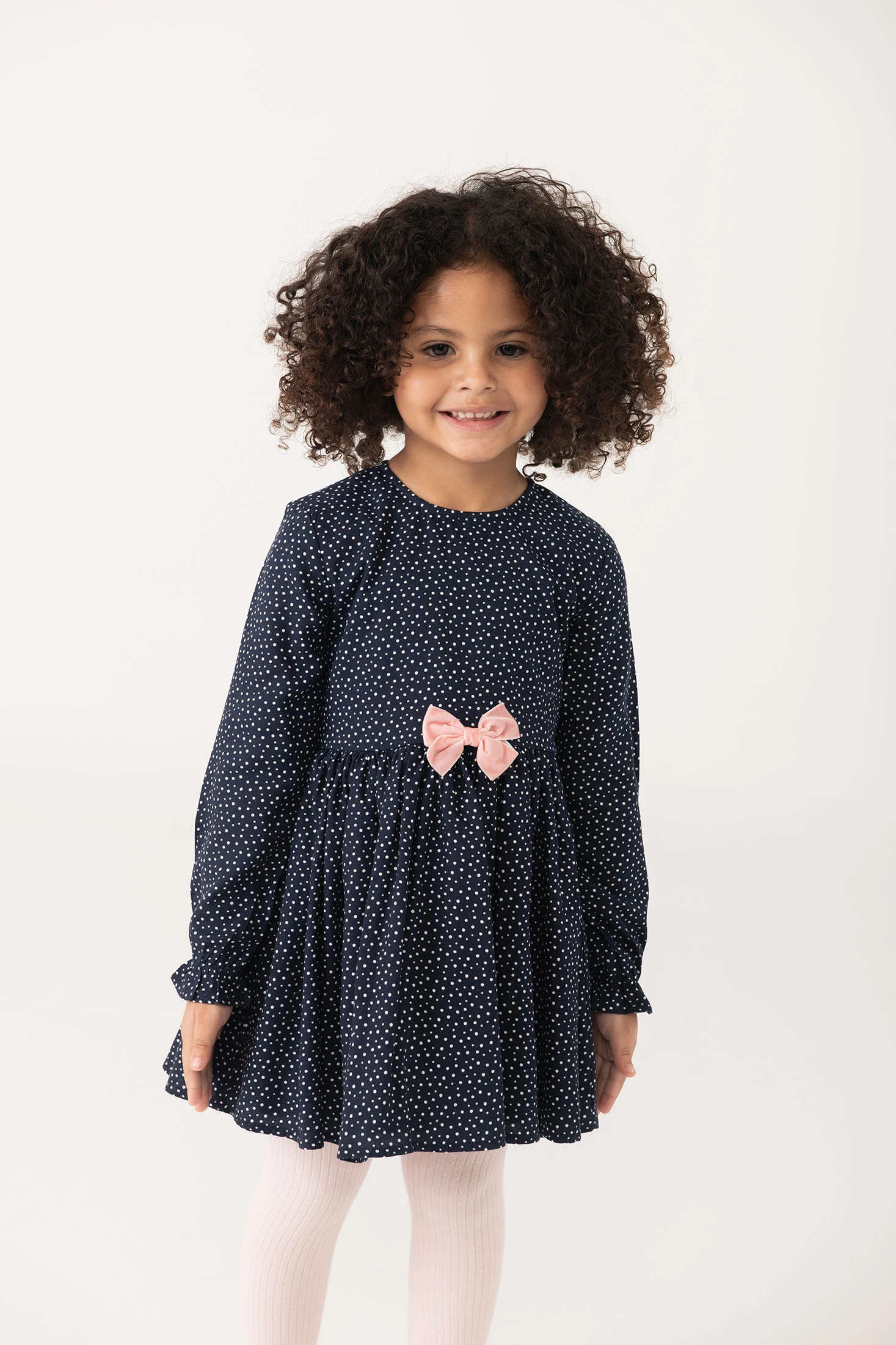Robe bleue avec imprimé à pois roses, parfaite pour les mois d'automne et d'hiver. Design élégant avec un col rond et des manches longues, idéales pour garder les petites au chaud et avec style. Un délicat nœud rose orne la taille, ajoutant une touche de douceur à l'ensemble. Disponible en tailles de 12 mois à 10 ans, cette robe est un choix charmant pour les événements spéciaux et les occasions festives. À combiner avec des collants ou des leggings pour un look complet et chaleureux.