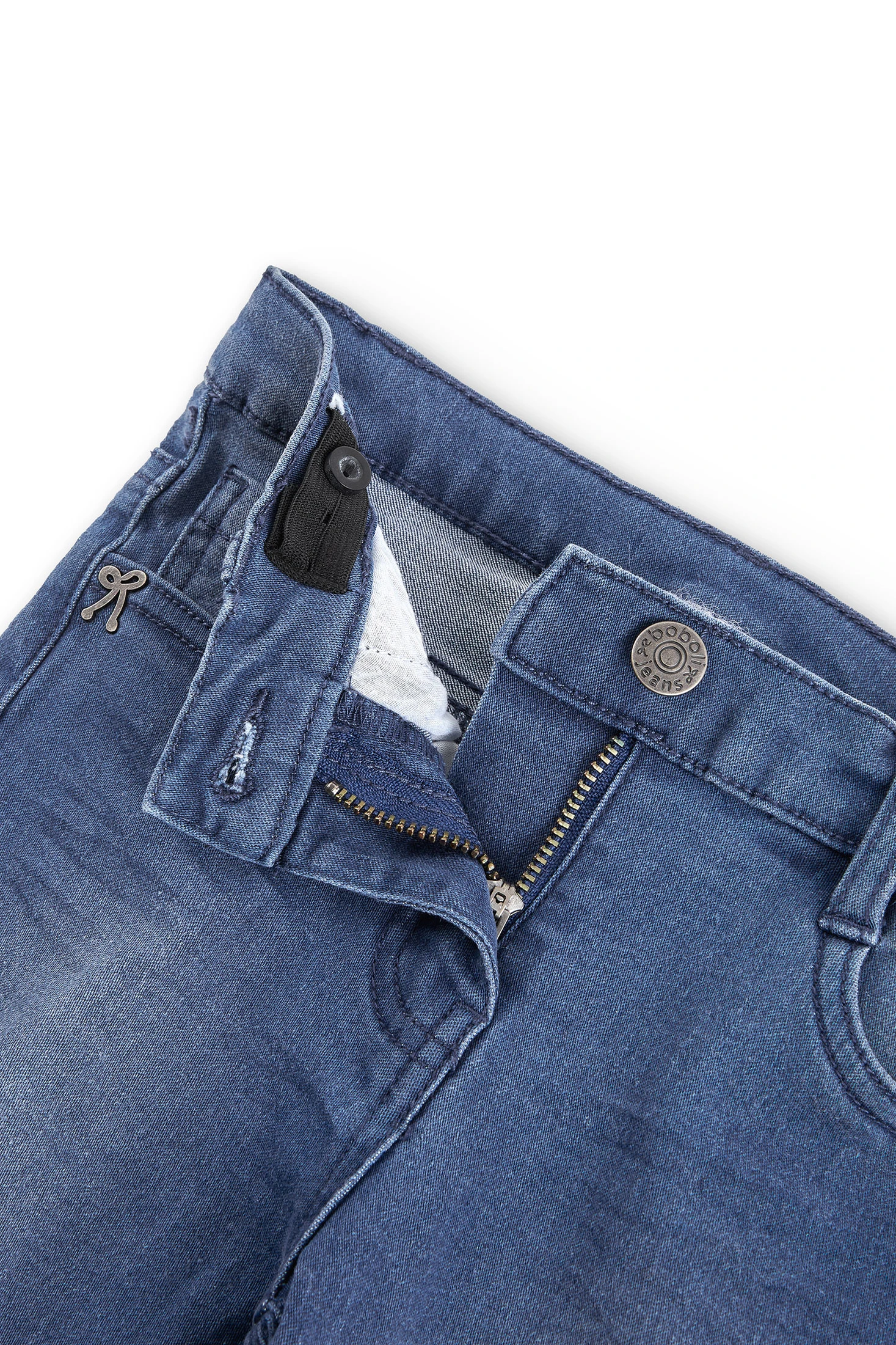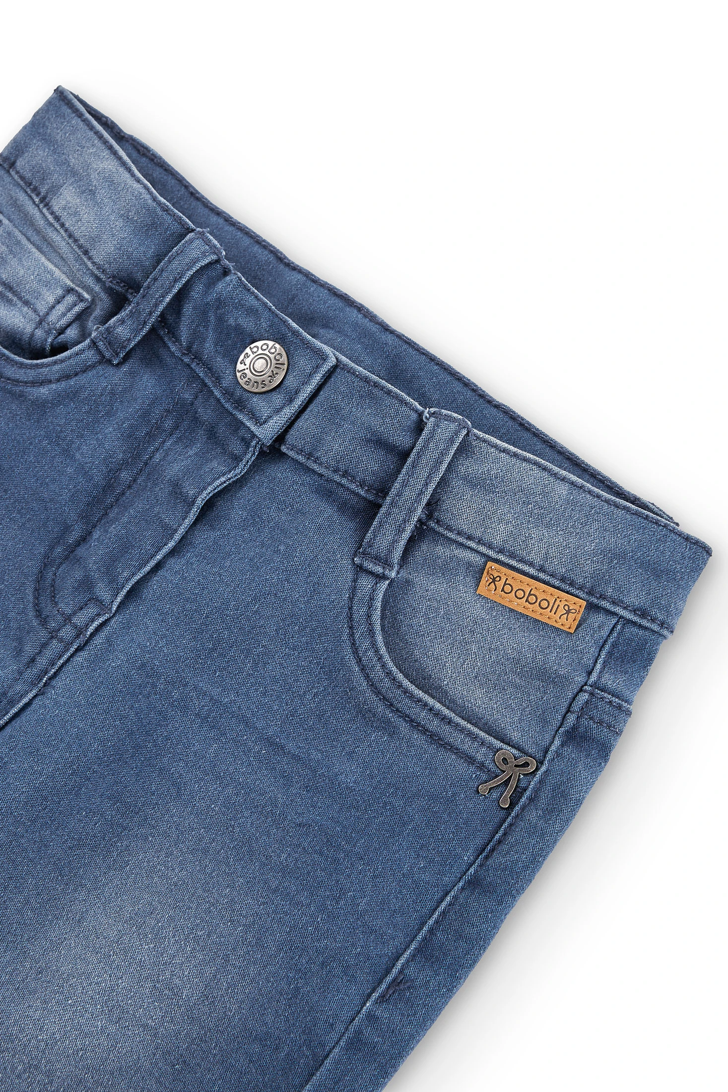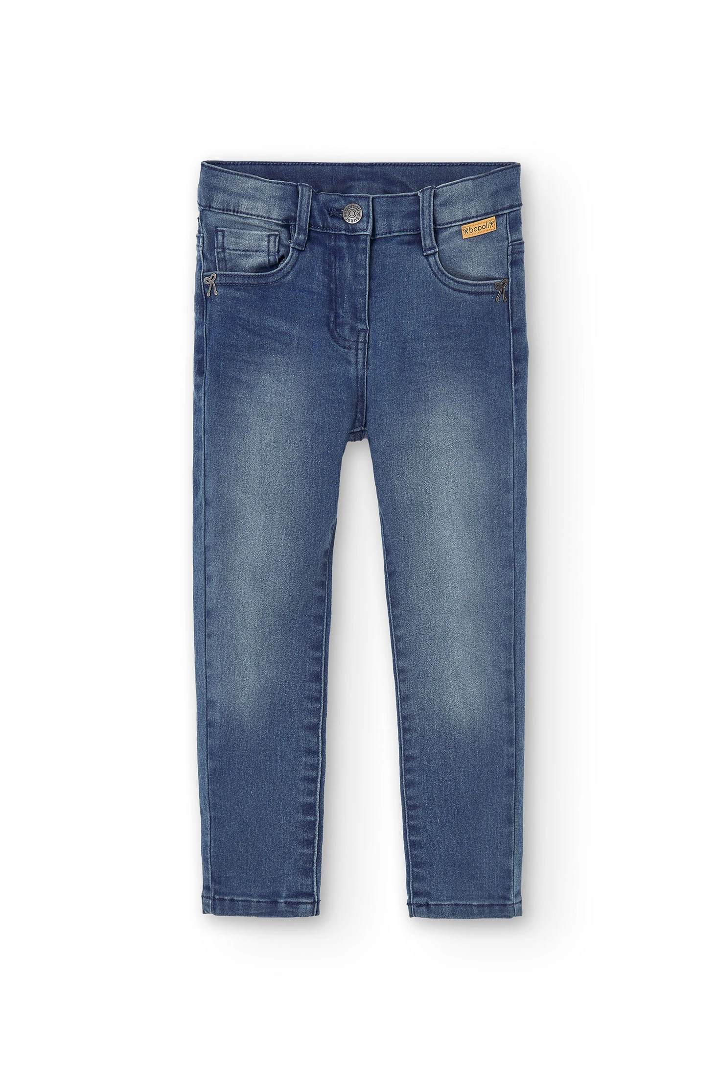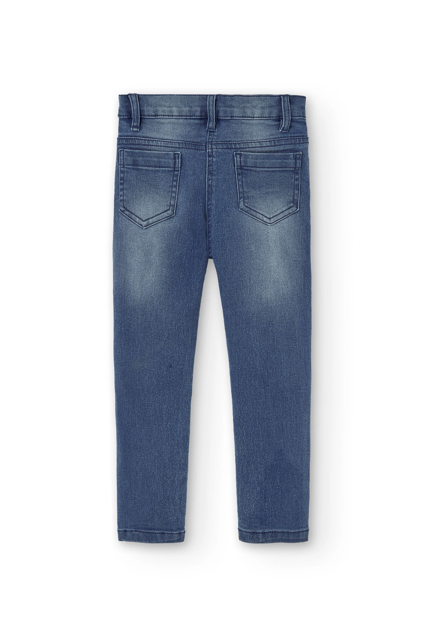 Pantalon en denim stretch bleu pour fille, fermeture à boutons, ceinture avec œillets élastiques et bouton intérieur. La décoration est une étiquette avec les détails de la marque. Ce vêtement présente des détails usés qui lui donnent un aspect plus ancien. Disponible de la taille 4 ans à 16 ans.