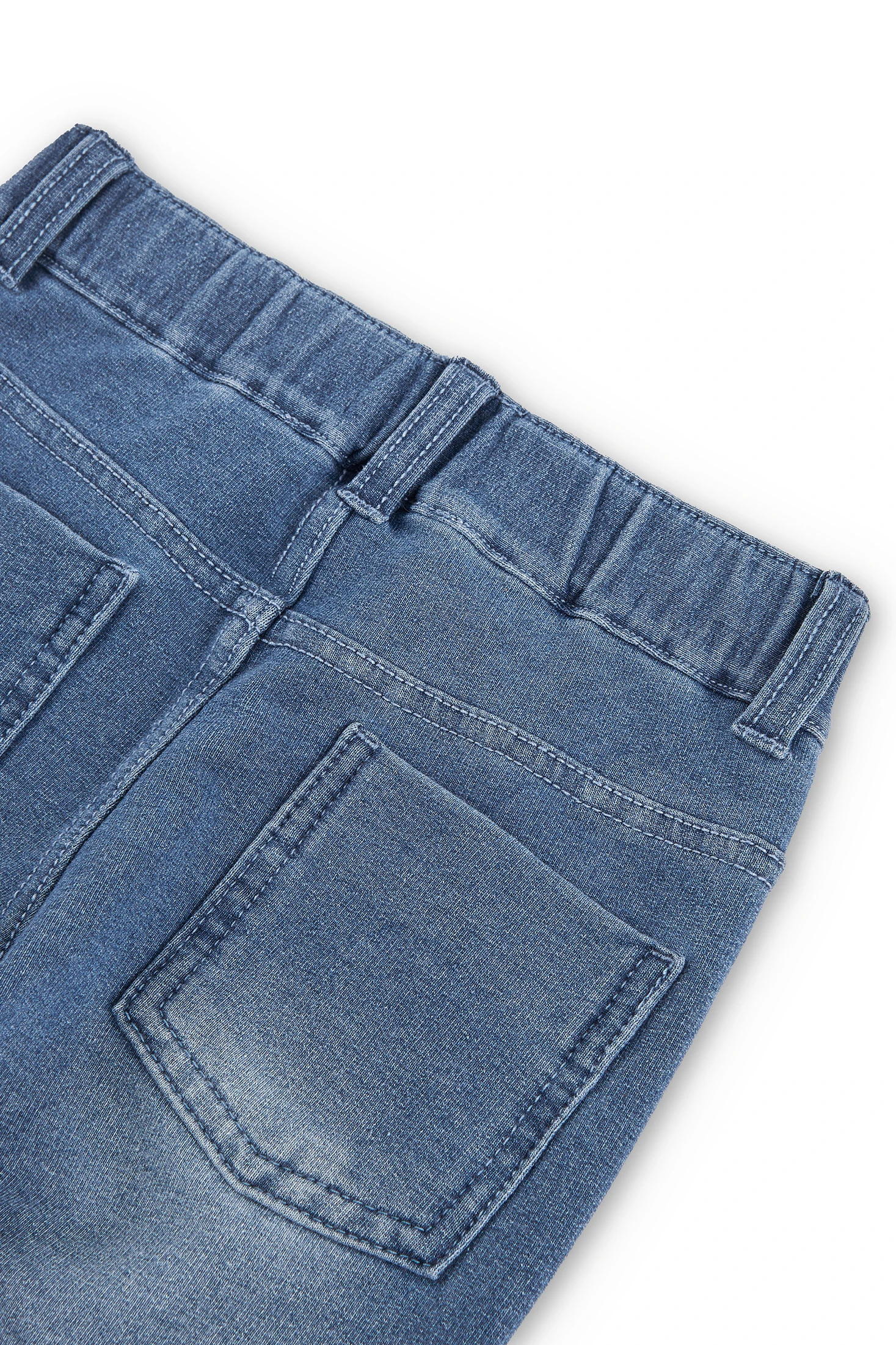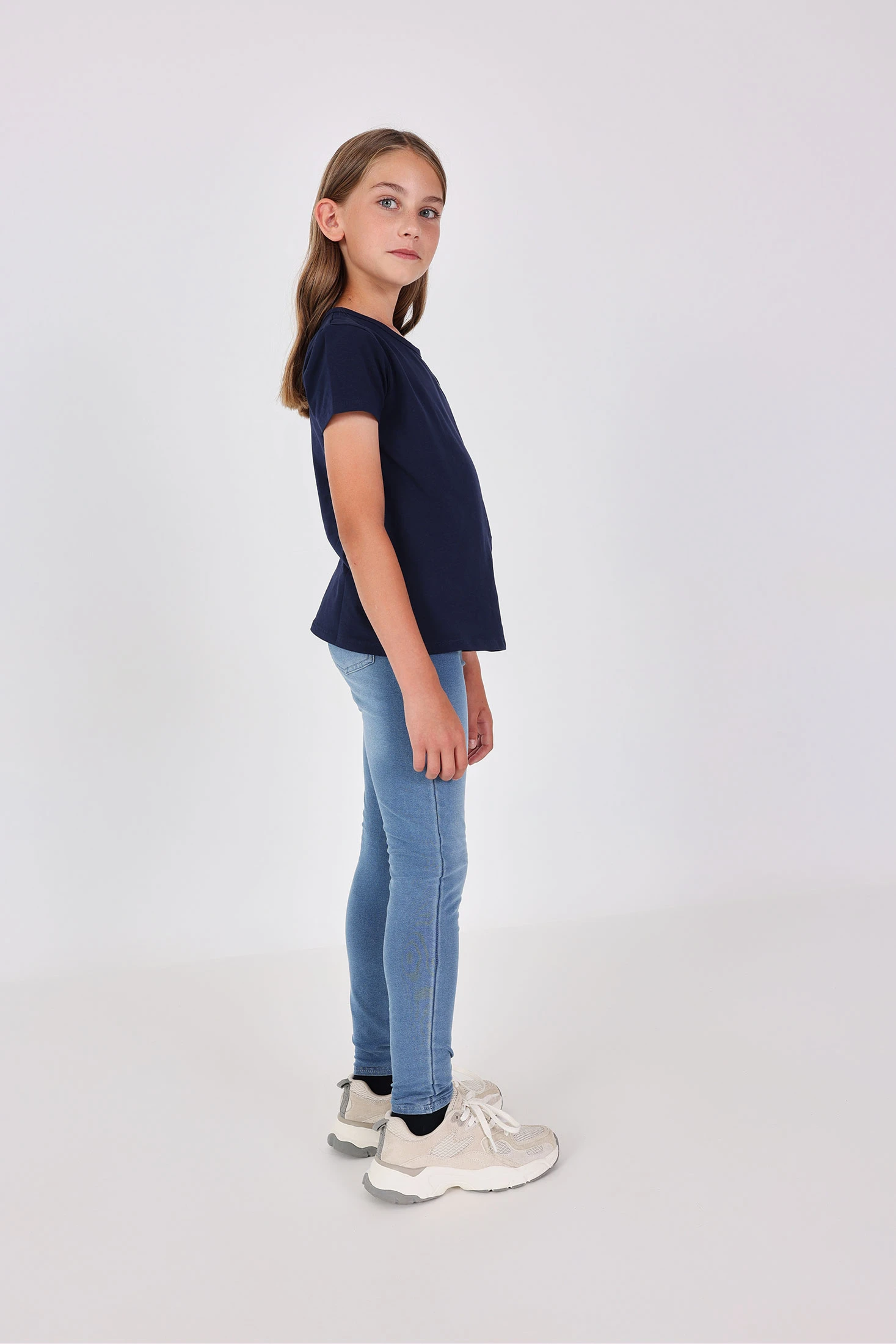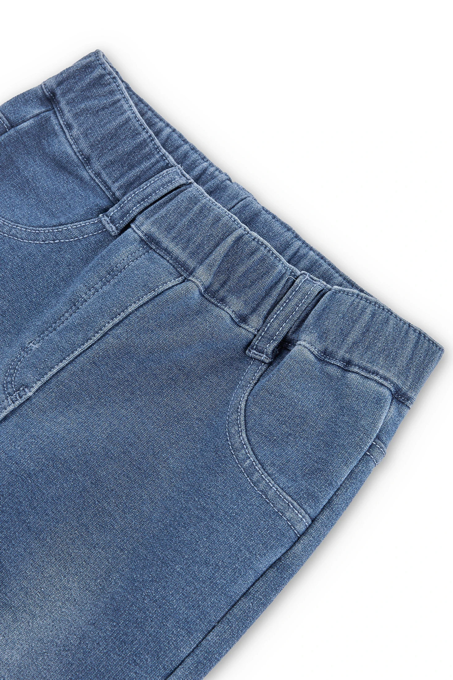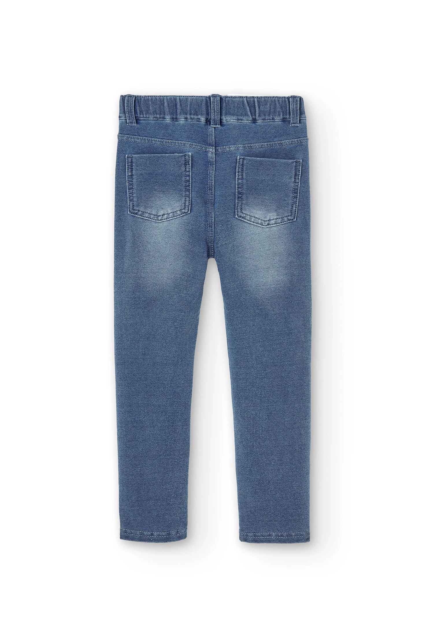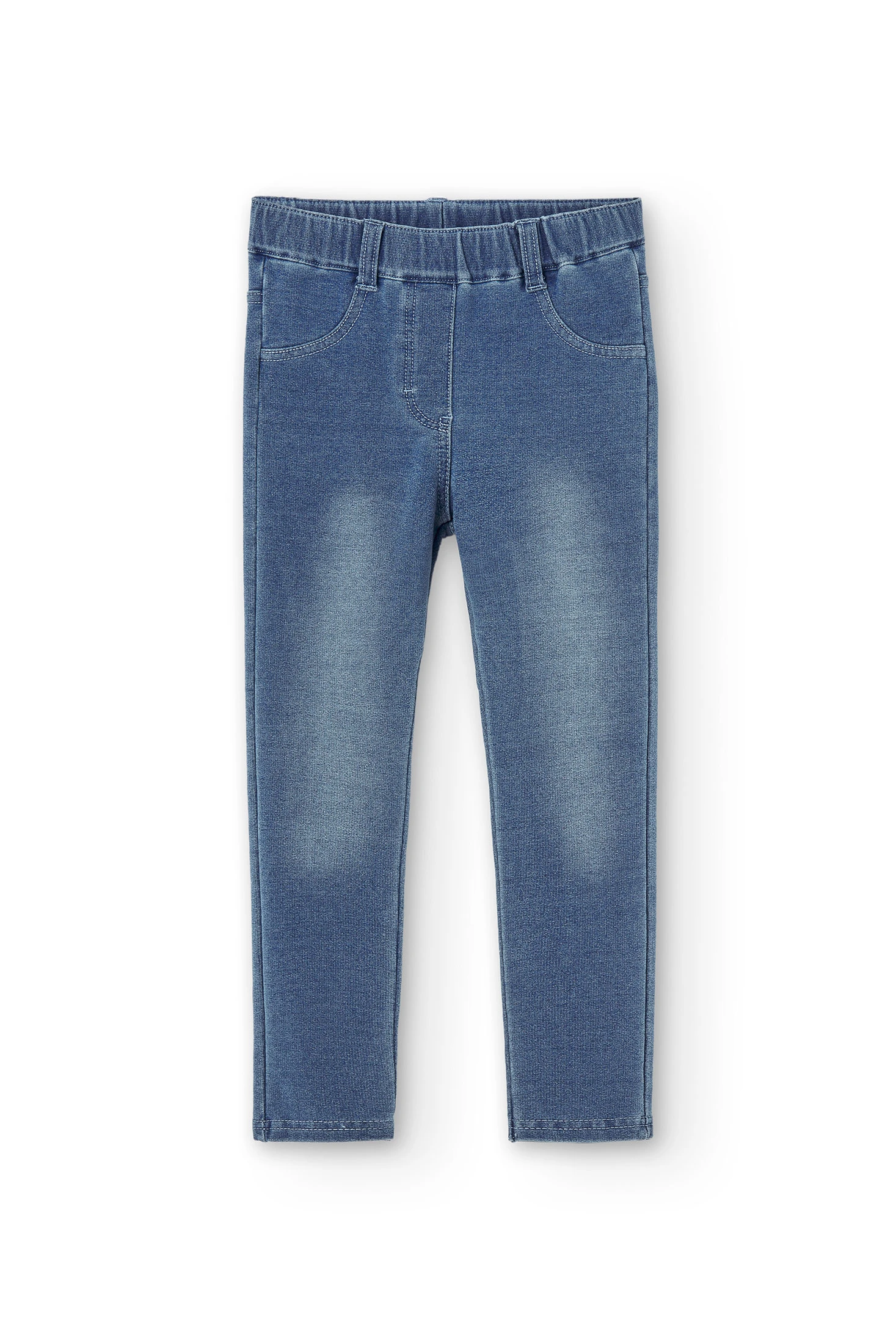 Pantalon en molleton stretch style jean délavé pour fille. Taille élastiquée. Les poches avant et la braguette sont décoratives. Étiquette au logo de la marque en décoration. Un procédé de finition donne au vêtement un aspect usé. Tailles disponibles de 4 à 16 ans.