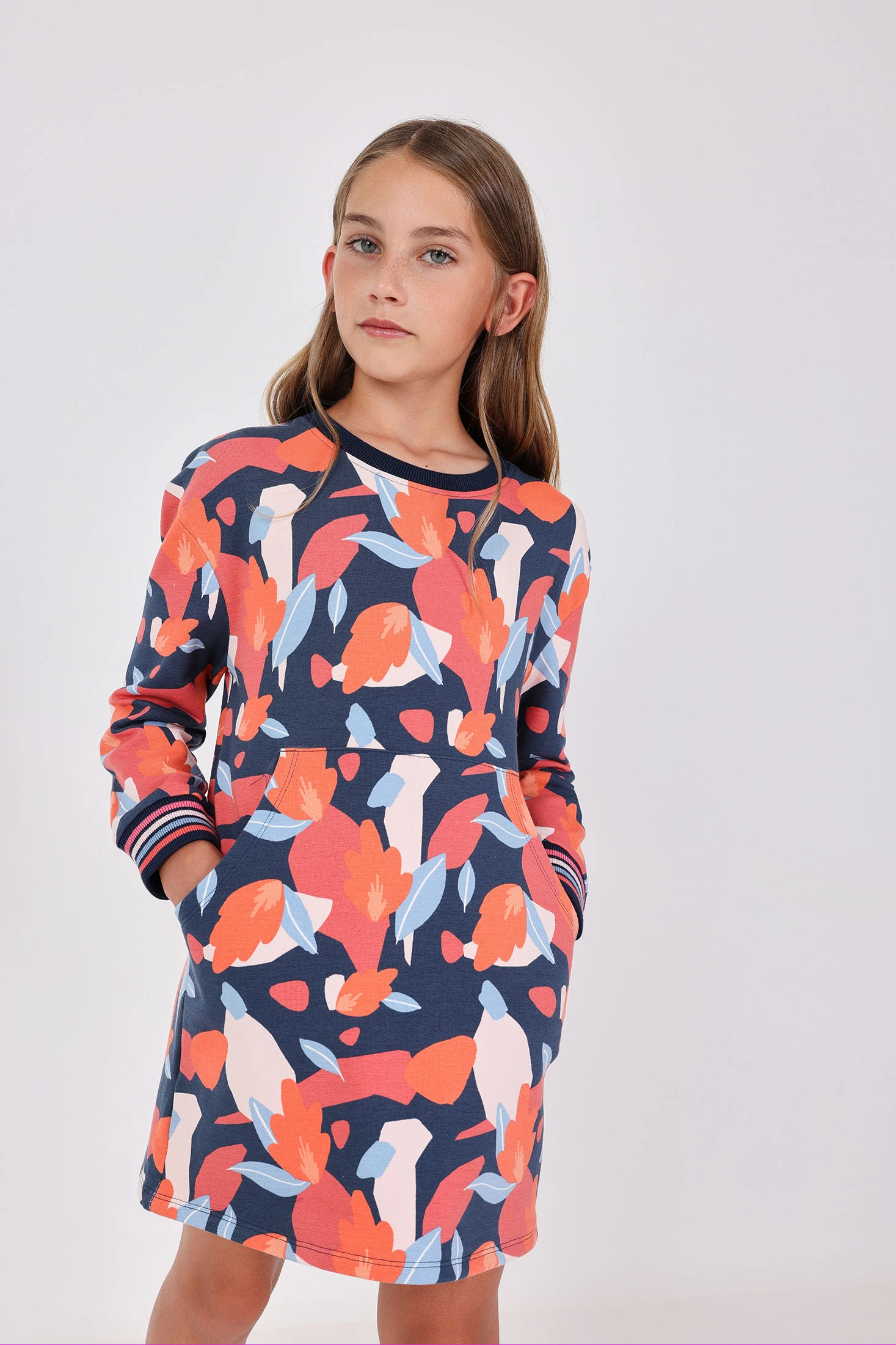 Robe en molleton pour fille avec un charmant motif floral dans des tons bleus, idéal pour les saisons d'automne et d'hiver. Fabriquée avec un tissu de molleton doux, elle offre chaleur et confort, parfaits pour toute occasion. Conçue avec un col rond et des manches longues, elle assure un ajustement confortable et élégant. Disponible en tailles de 2 à 14 ans, elle peut être facilement associée à des collants ou des leggings pour un look complet et moderne lors des jours les plus froids. Pensée pour les mères et pères qui apprécient le style et la praticité dans l'habillement quotidien de leurs filles.