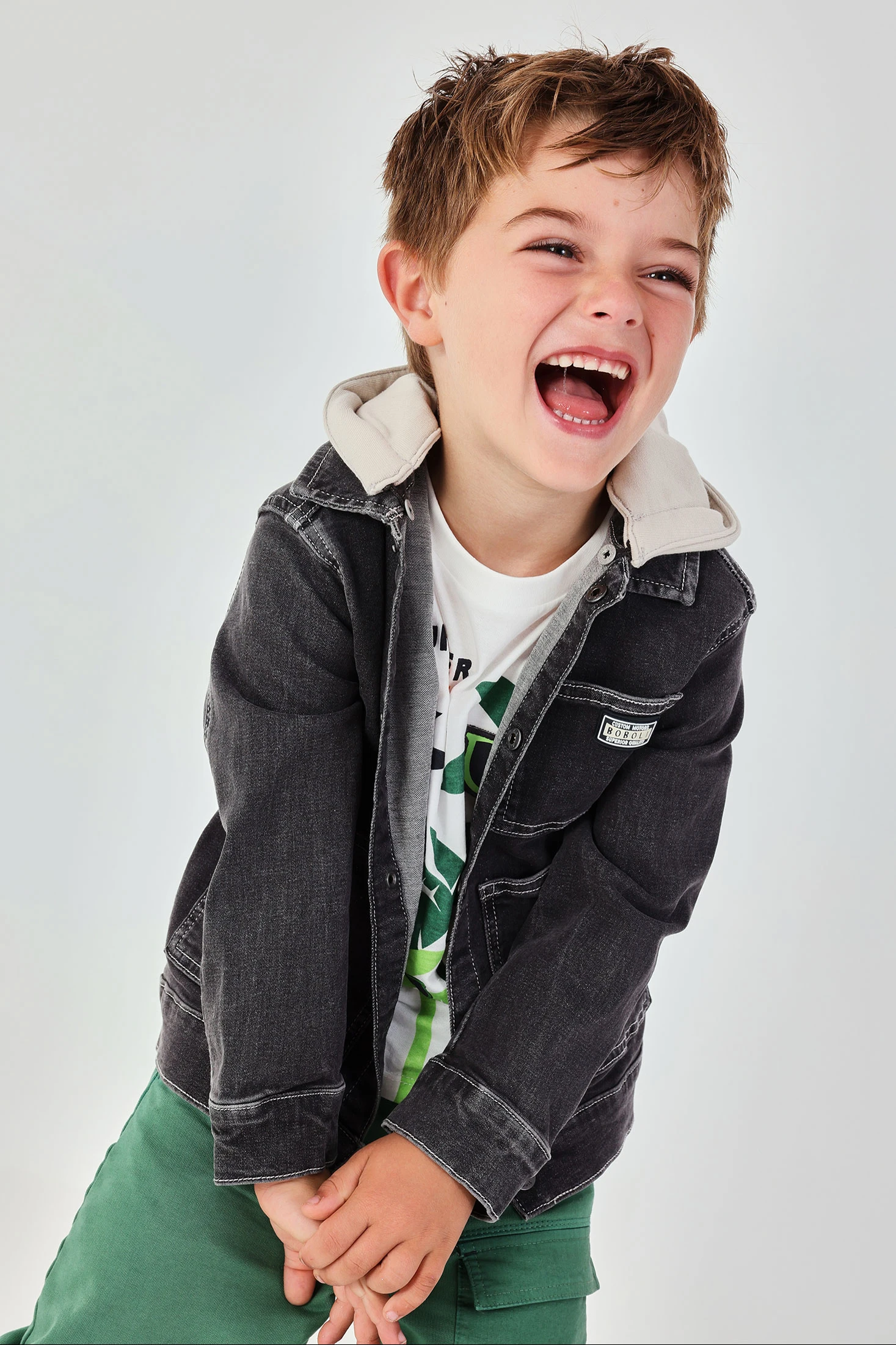 Veste en denim grise pour garçon parfaite pour le printemps. Fabriquée dans un matériau résistant et doux, elle présente un design polyvalent avec une capuche intégrée pour une protection accrue. Disponible en tailles de 2 ans à 14 ans, elle est idéale pour accompagner votre enfant dans sa croissance. Sa couleur gris foncé et son design classique la rendent facile à assortir avec différents styles. Vêtement pratique et moderne pour garder votre enfant au chaud avec style.